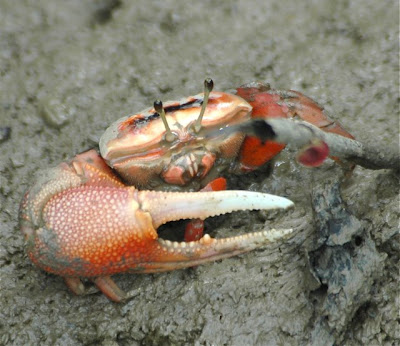 As soon as I passed through the border gate I found myself looking down at numbers of fiddler crabs scuttling over the mud flats or waving their enormous claws in display. There are, apparently, six species of fiddler crab at Mai Po (for details, with lots of pictures, see www.afcd.gov.hk/english/publications/publications_con/files/12.pdf). This one appears to be Uca arcuata.