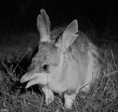 I was charmed by the Hare-Wallaby, but it was when a second animal wandered into the spotlight that I fell in love. I had seen plenty of pictures of the Greater Bilby or Dalgyte (Macrotis lagotis), but none prepared me for the living creature. Since all I can offer here are pictures, too, please take it from me that this is one of the leading candidates for the title of Cutest Mammal on Earth. In Australia its image is sometimes used as a substitute for the Easter Bunny.