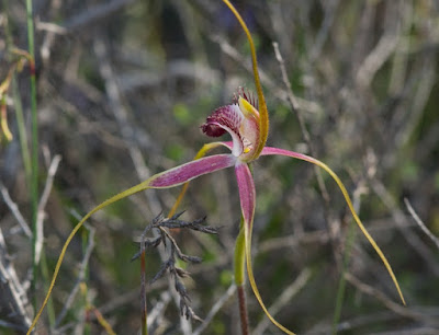 It was, though, this flower, a spider orchid, that became (at least for me) the most memorable single blossom of the entire trip.  I can't say exactly why, but its combination of weirdness and beauty quite fascinated me - or perhaps  I knew, even though we still had a few days left in our Western Australian trip, I was unlikely to see anything quite like it again.